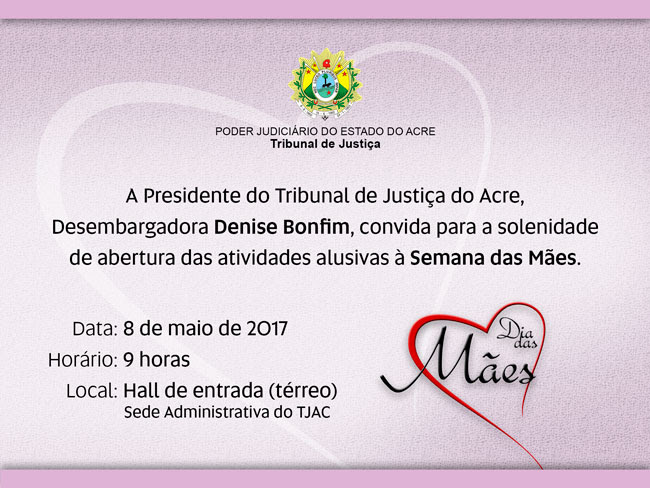 O Tribunal de Justiça do Acre (TJAC) inicia na segunda-feira (8) as atividades em alusão ao Dia das Mães – comemorado no segundo domingo de maio. A programação terá início às 9 horas, no hall de entrada (térreo) da Instituição.