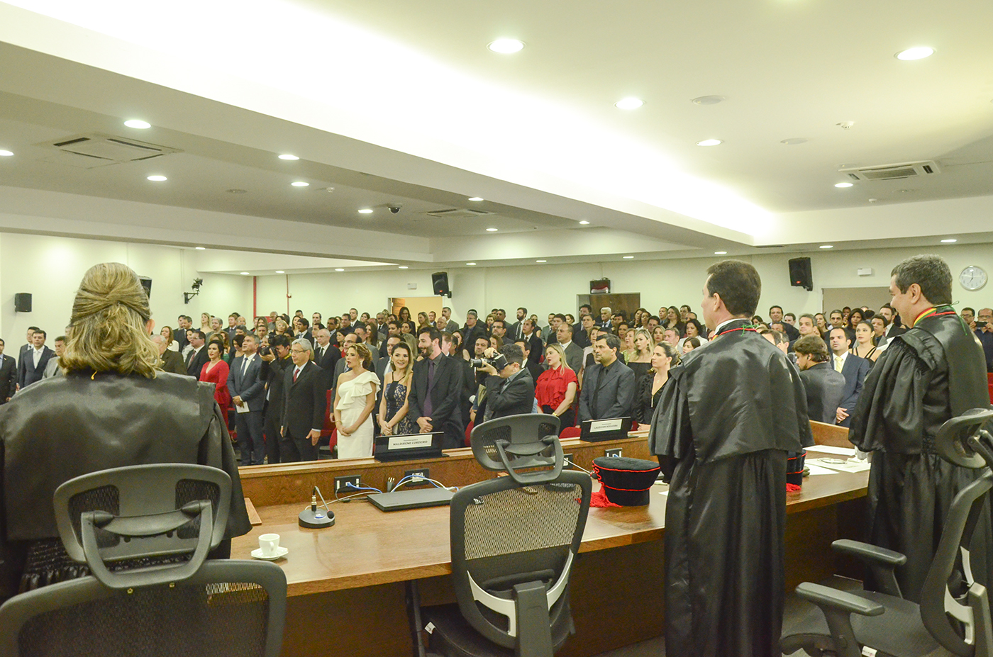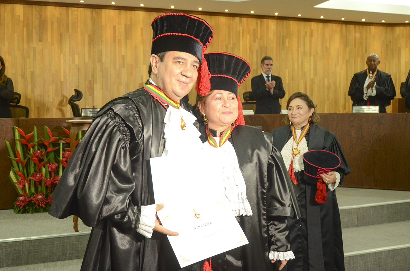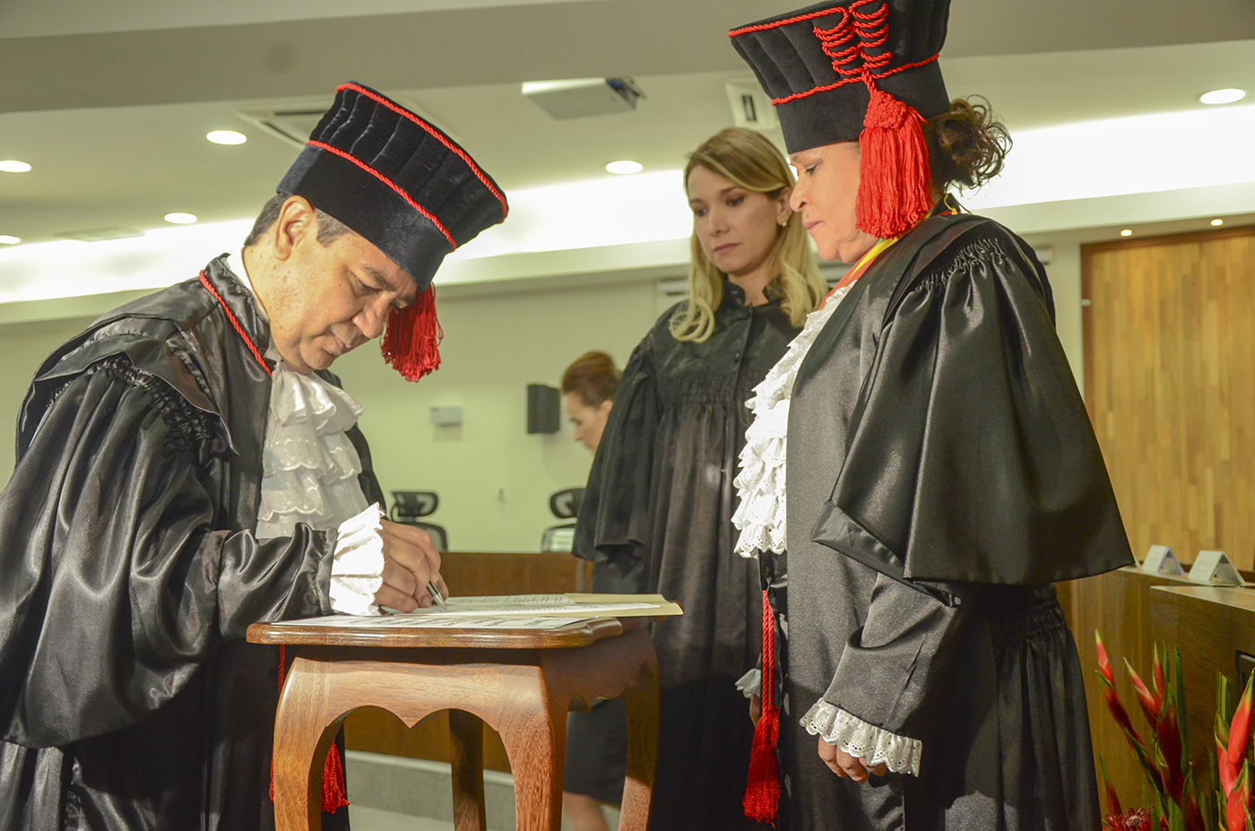 Em seguida, ele assinou o termo de investidura no cargo de desembargador e recebeu o Colar do Mérito Judiciário acompanhado do Diploma de Chancela em observância à Resolução n° 22 do Tribunal Pleno, que determina a honraria ser conferida a todo novo membro no ato de sua posse.