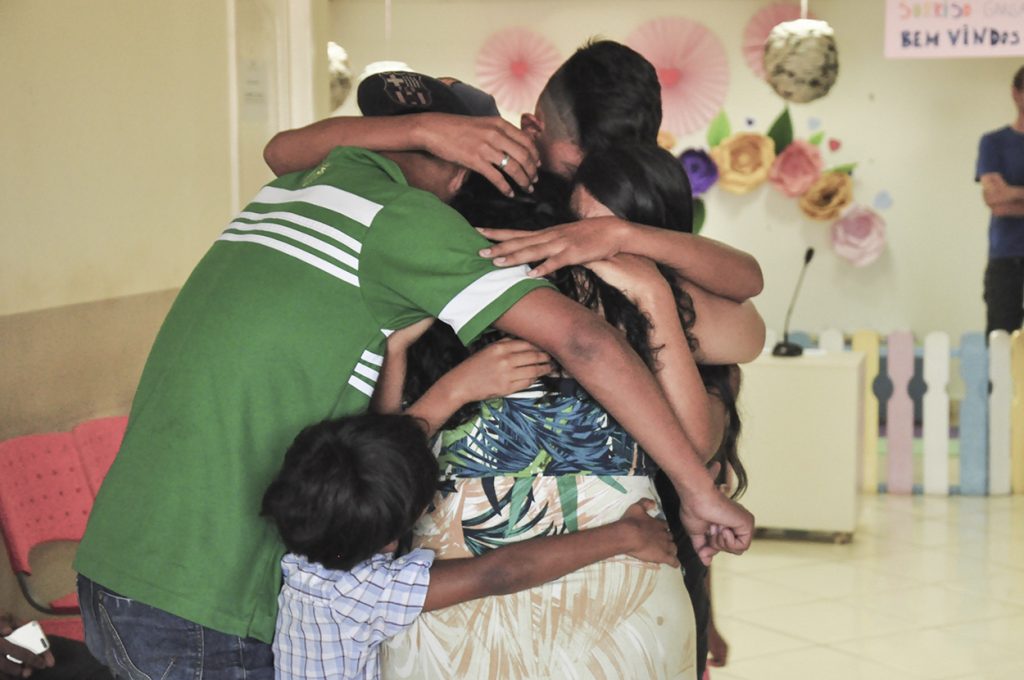 Sentados, sete filhos de uma reeducanda aguardavam o momento de ela chegar. Foi o maior abraço coletivo da ocasião e emocionou toda a equipe presente na unidade. A reenducanda afirmou que o oitavo filho, já maior de idade, não pôde comparecer, mas, mesmo assim, ela ressaltou ser um momento marcante, principalmente, por ela poder tocar nas crianças, pois, segundo ela, estavam há um ano sem se encontrarem.