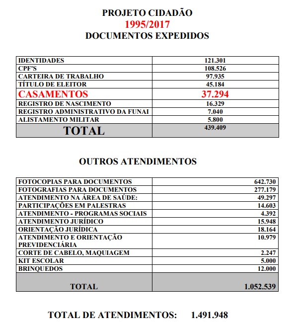 Com 1.491.948 milhão de atendimentos, a finalidade primordial do Projeto Cidadão é de assegurar à população mais necessitada o direito à documentação básica, como também o acesso rápido e gratuito aos serviços públicos fundamentais, a exemplo de saúde, trabalho e educação, além da área jurídica.