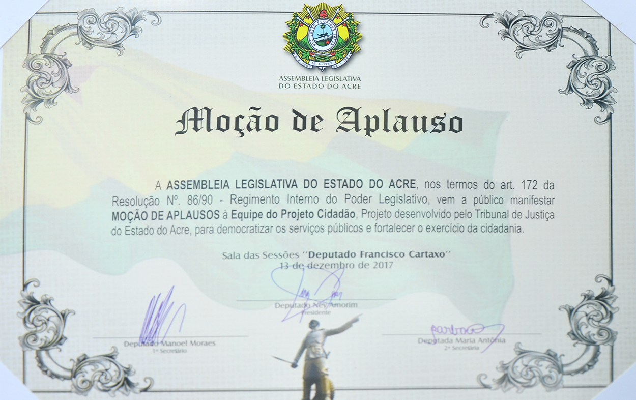 O Projeto Cidadão, uma das principais atividades da área social da atual gestão do Tribunal de Justiça do Acre (TJAC), foi destaque durante sessão solene da Assembleia Legislativa do Acre (Aleac), nesta quarta-feira (13), data de encerramento das atividades parlamentares da Casa. A Instituição recebeu Moções de Aplauso pelo relevante serviço prestado à sociedade. A indicação da homenagem foi feita pelo deputado estadual Nelson Sales (PV-AC).