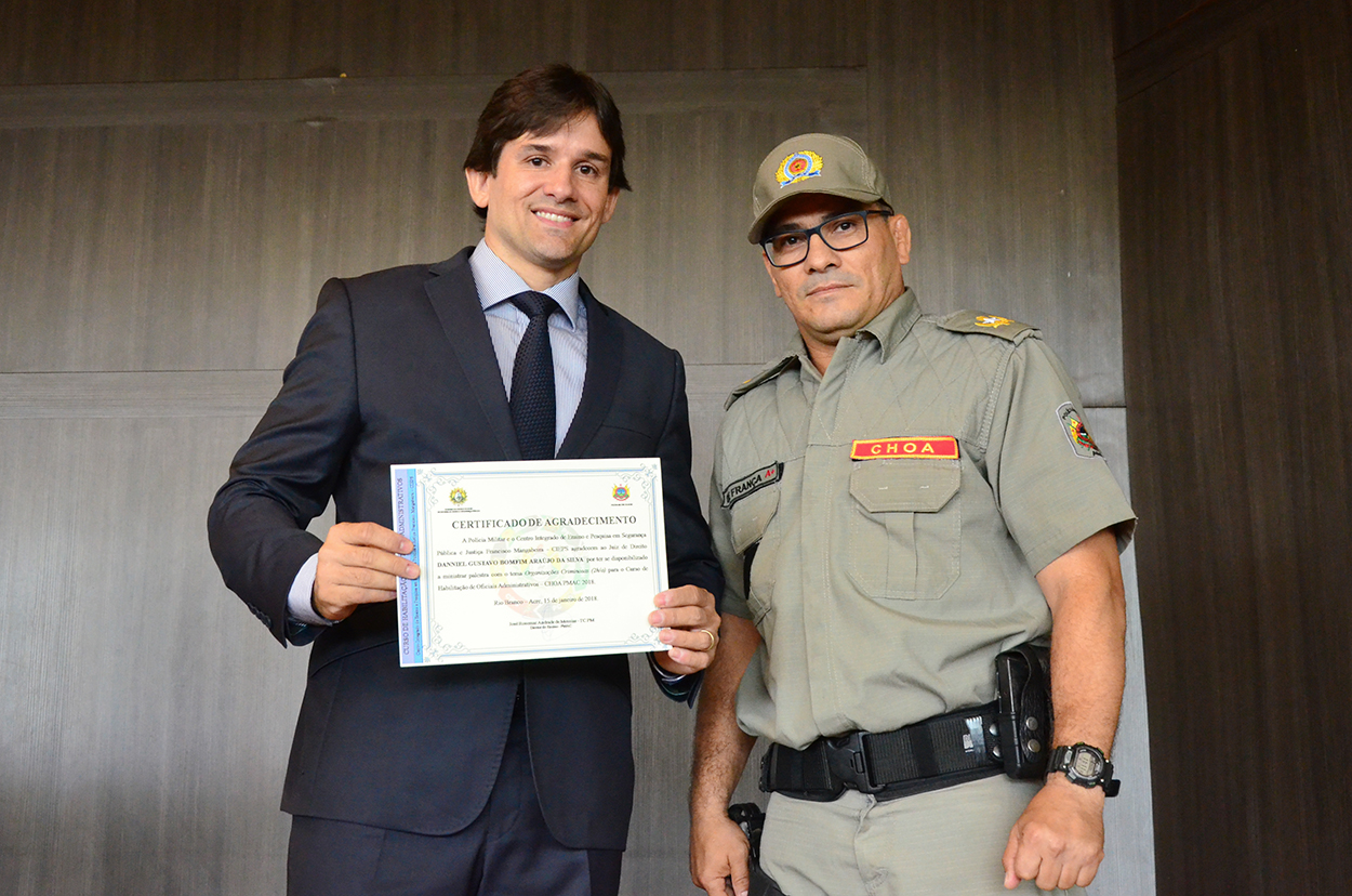 Na ocasião, o magistrado recebeu um Certificado de Agradecimento da PMAC, em reconhecimento da importância do estreitamento da parceria entre o Poder Judiciário com o Executivo, que coopera na qualificação do quadro efetivo do Estado.