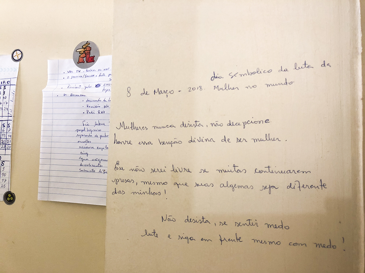 Em uma das celas, uma poesia chamava a atenção. “Mulheres nunca desista (sic), não decepcione (sic). Honre essa bênção divina de ser mulher. Eu não serei livre se muitas continuarem presas, mesmo que suas algemas sejam diferentes das minhas. Não desista, se sentir medo, lute e siga em frente, mesmo com medo”. Mensagem que reflete o desejo coletivo de deixar a prisão, e seguir em frente.