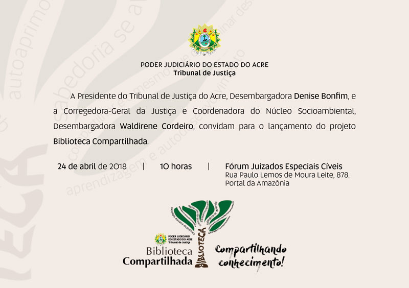 A presidente do Tribunal de Justiça do Acre (TJAC), desembargadora Denise Bonfim, e a corregedora-geral da Justiça, desembargadora Waldirene Cordeiro, lançarão o projeto Biblioteca Compartilhada, às 10h, desta terça-feira (23), no Fórum dos Juizados Especiais Cíveis, na Cidade da Justiça, em Rio Branco.