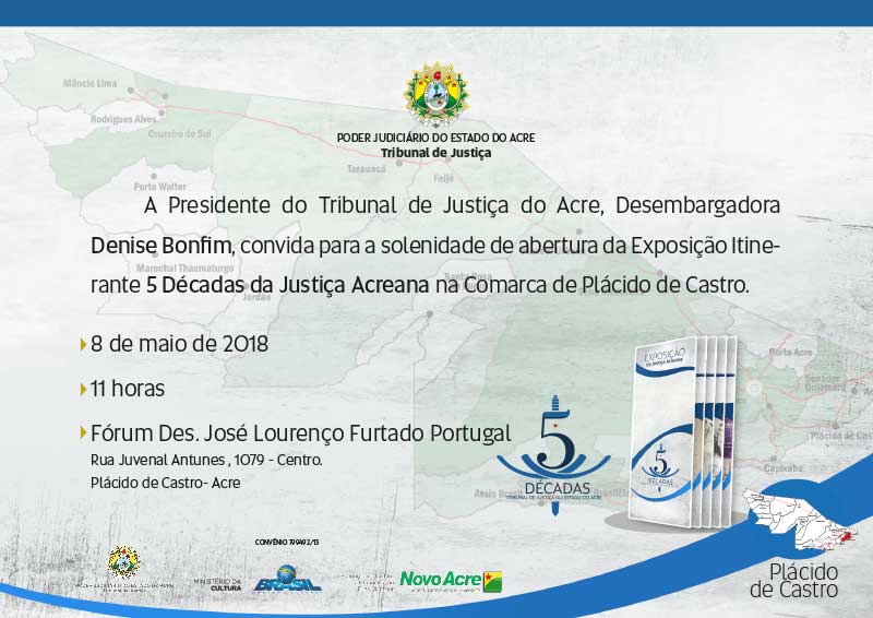 Com o objetivo de destacar a história da Justiça Estadual, sobretudo no que diz respeito à defesa da democracia e a garantia dos direitos dos cidadãos, a Comarca de Plácido de Castro recebe, na próxima terça-feira, 8, a “Exposição 5 Décadas da Justiça Acreana”. A cerimônia de abertura acontecerá às 11h, no Fórum Desembargador José Lourenço Furtado Portugal.