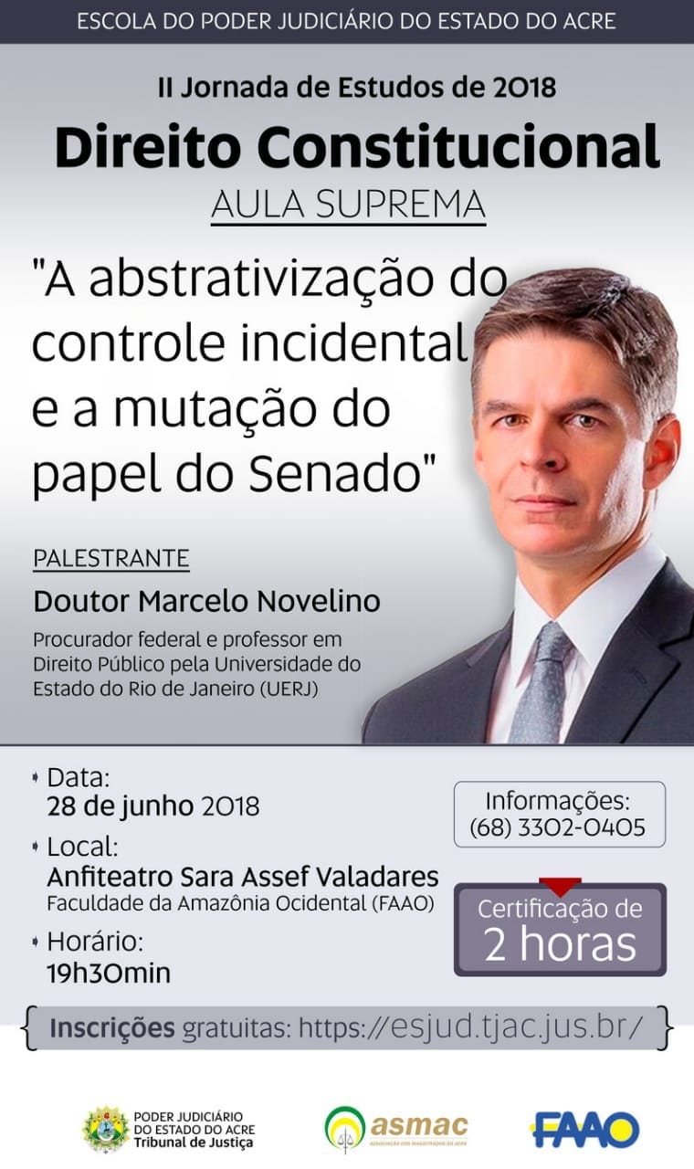 As inscrições para a palestra “A abstrativização do controle incidental e a mutação do papel do Senado” serão encerradas na segunda-feira (25). A atividade é promovida pelo Tribunal de Justiça do Acre, por meio da Escola do Poder Judiciário (Esjud). Voltado a todos os públicos, o evento terá a participação do procurador federal Marcelo Novelino, um dos principais nomes em matéria constitucional no Brasil.