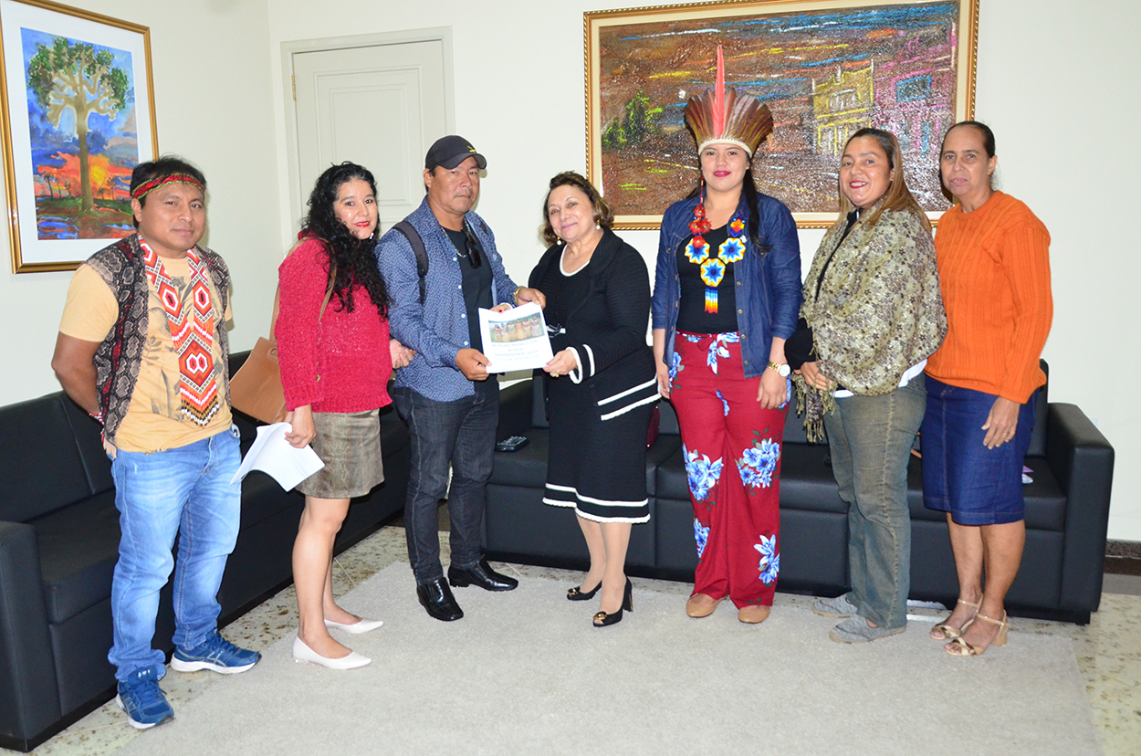 A presidente do Tribunal de Justiça do Acre (TJAC), em exercício, desembargadora Eva Evangelista, recebeu, no início da tarde desta sexta-feira (8), no gabinete da Presidência do TJAC do Palácio da Justiça, uma comissão de líderes indígenas da etnia Shanenawá, do município de Feijó, distante cerca de 360 quilômetros de Rio Branco.