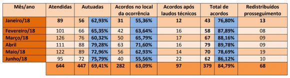 De acordo com o relatório estatístico da Justiça Volante de Rio Branco, somando-se os acordos feitos após os laudos técnicos, a conciliação, de janeiro a junho de 2018, alcançou 84,78% nas ocorrências atendidas.