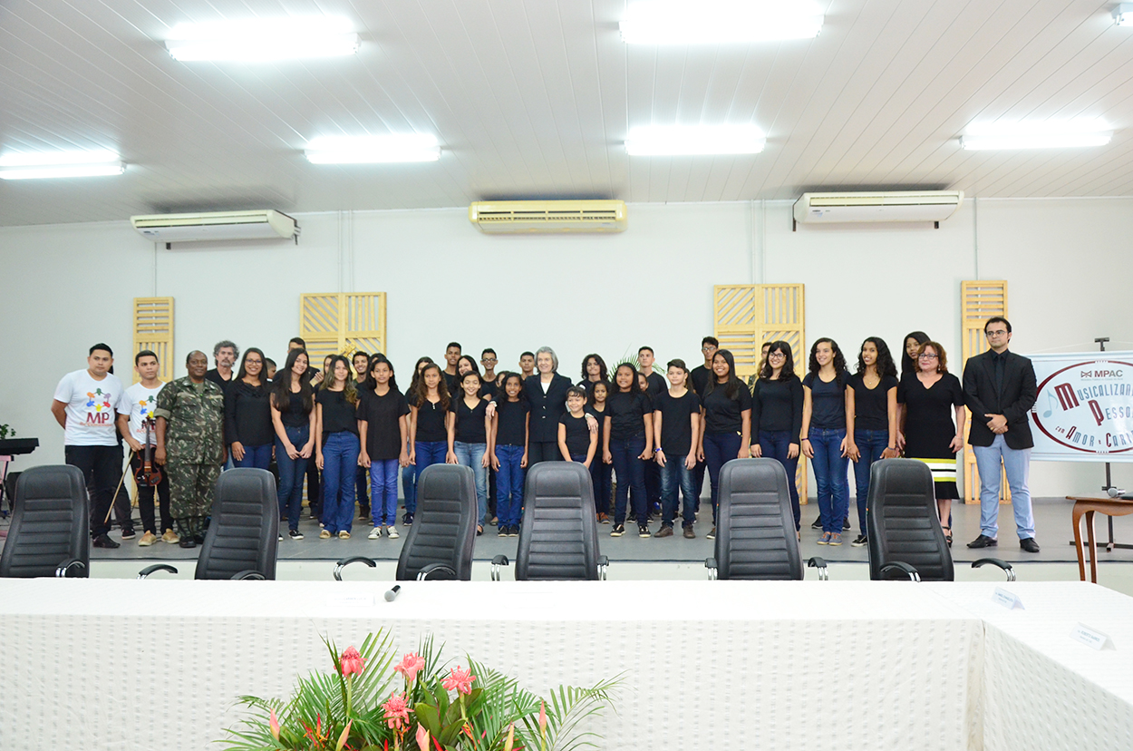 Na chegada à Cidade da Justiça, a ministra Cármen Lúcia foi recepcionada com uma apresentação musical de crianças do Conservatório ‘Musicalizando Pessoas com Amor’, coordenado pelo Ministério Público Estadual, em Cruzeiro do Sul.