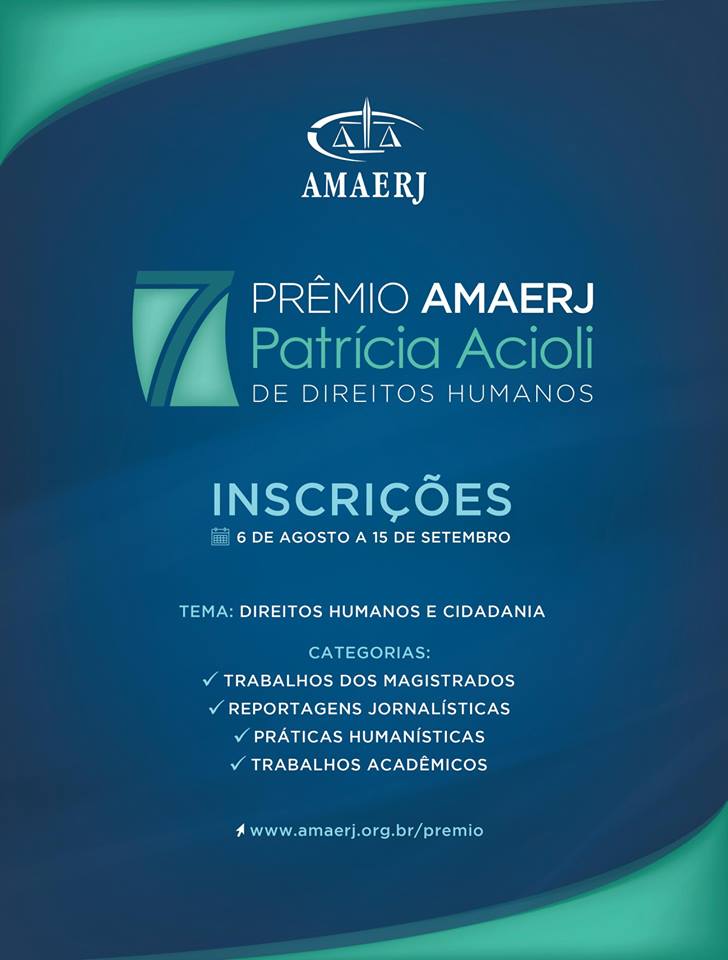 A Associação dos Magistrados do Estado do Rio de Janeiro lançou a 7ª edição do Prêmio AMAERJ Patrícia Acioli de Direitos Humanos. A premiação é nacional e tem quatro categorias: Reportagens Jornalísticas, Trabalhos dos Magistrados, Práticas Humanísticas e Trabalhos Acadêmicos. O tema é “Direitos Humanos e Cidadania”.