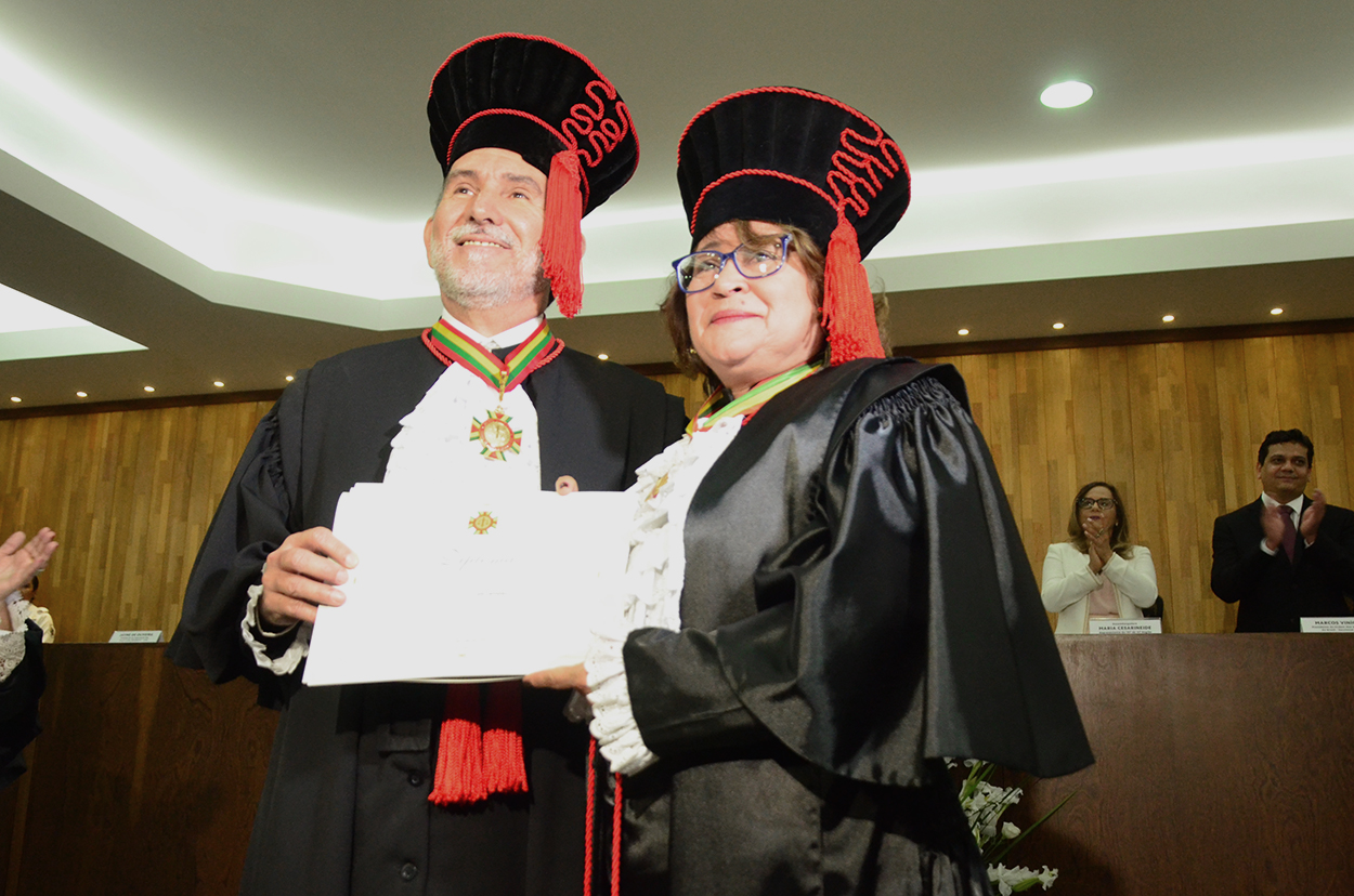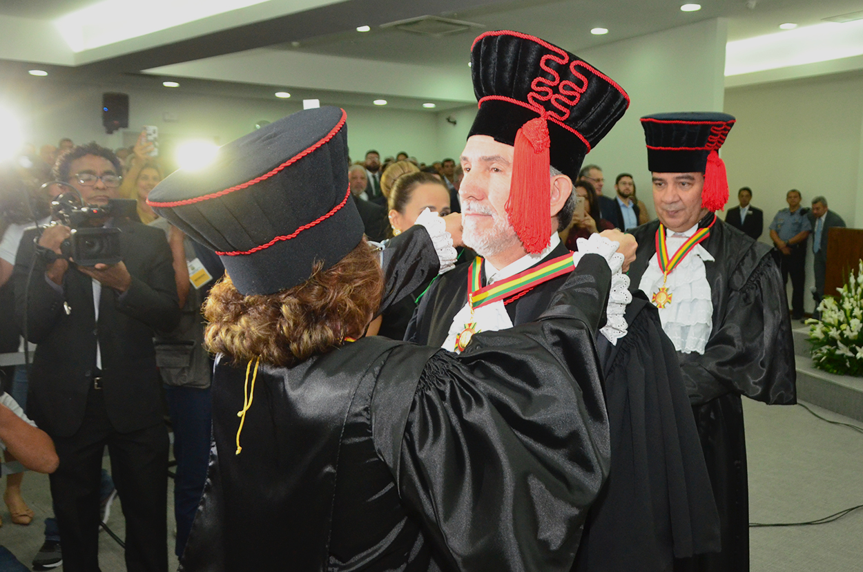 Em seguida, ele assinou o termo de investidura no cargo de desembargador e recebeu o Colar do Mérito Judiciário acompanhado do Diploma de Chancela em observância à Resolução n° 22 do Tribunal Pleno, que determina a honraria ser conferida a todo novo membro no ato de sua posse.