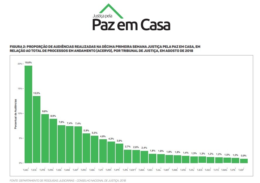 Os resultados dessa semana apontam o Tribunal de Justiça do Acre (TJAC) como a unidade que mais realizou audiências (de instrução e preliminares), proporcionalmente ao número de processos em andamento, alcançando 19,6%. O impacto também foi destacado na questão de proferir maior número de sentenças e/ou conceder maior quantidade de medidas protetivas ao todo, proporcionalmente ao número de processos em trâmite no Tribunal, que foi de 20,2% do total.