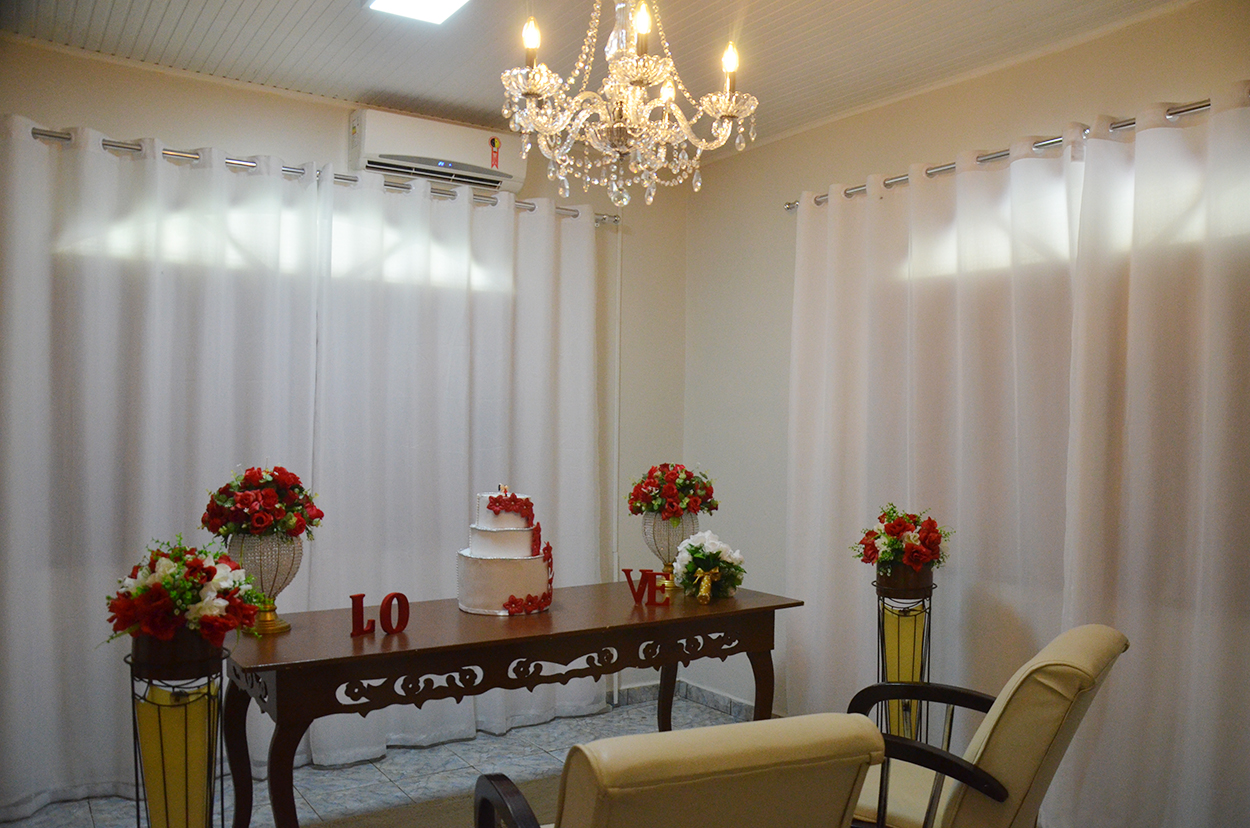 Além disso, na Serventia Extrajudicial foi montada uma sala decorada para realização dos casamentos. O tabelião contou que o objetivo é possibilitar um momento especial aos casais. “O casamento é um momento único na vida das pessoas e às vezes as pessoas não têm condições, não tem uma foto para guardar de recordação. A grande maioria dos casamentos é isento e o objetivo é dar um momento especial para aquelas pessoas que não tem condição nem de pagar o casamento, imagina fazer uma festa”.