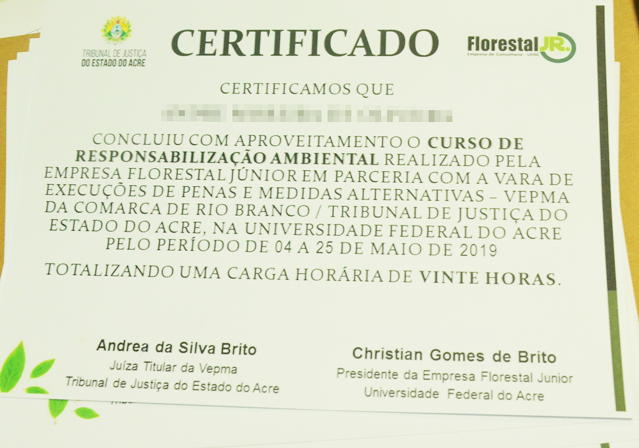 Antecedendo a comemoração do Dia Mundial do Meio Ambiente, que será no dia 6 de junho, foram entregues os certificados de conclusão à 1ª turma do “I Curso de Responsabilização Ambiental”, para pessoas em cumprimento de alternativas penais, nesta sexta-feira, 31 de maio, na Vara de Penas e Medidas Alternativas da Comarca de Rio Branco, no Fórum Criminal, na Cidade da Justiça.