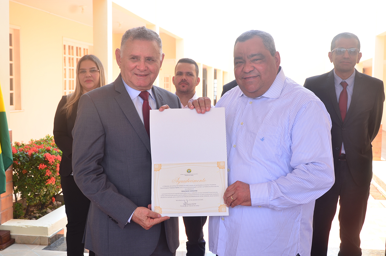 O presidente Francisco Djalma fez questão de prestar uma homenagem ao prefeito Mazinho, lhe entregando um certificado de agradecimento, e também falou da importância do apoio da Câmara de Vereadores para que a reforma fosse possível. “O Poder Judiciário agradece imensamente pelo apoio do prefeito e da Câmara. A palavra é gratidão, e são parcerias como essa que nos engrandece, pois assim poderemos atender melhor nosso jurisdicionado, e com boas condições de trabalho ao servidor. Estamos juntos nessa empreitada sempre que o foco for o bem da comunidade”, ressaltou.