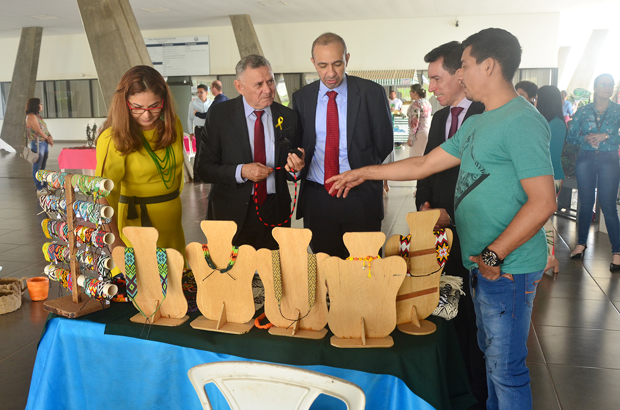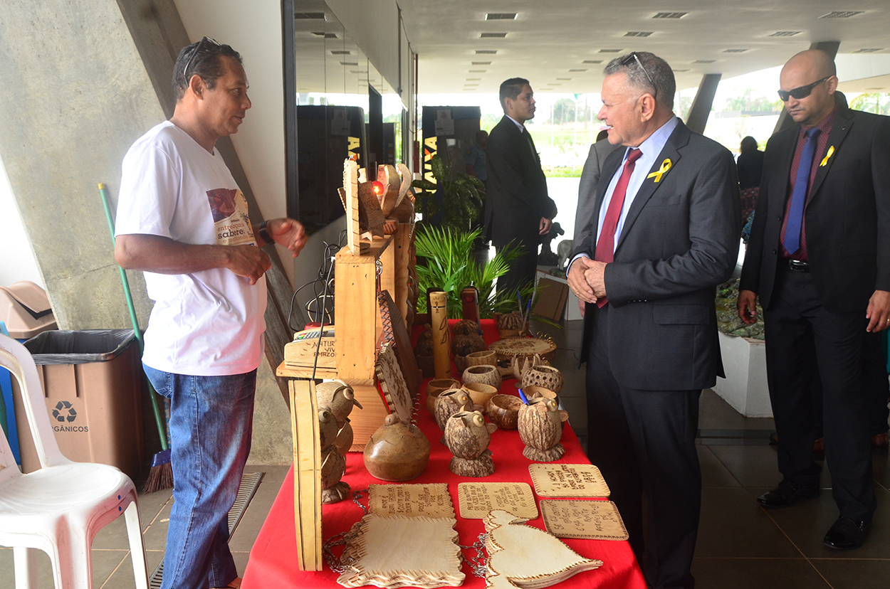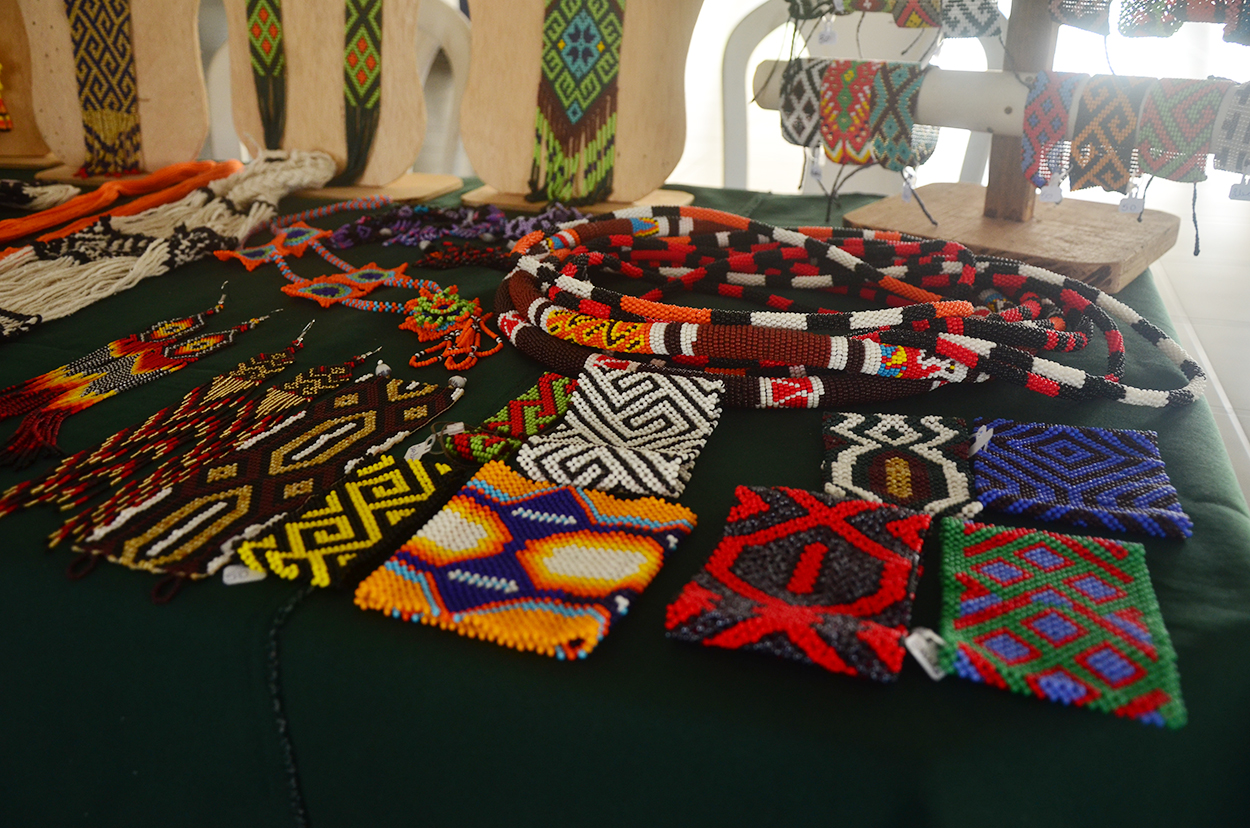 Os colares e a tecelagem indígena também chamaram a atenção dos visitantes. O representante da Associação das Produtoras de Artesanato das Mulheres Indígenas Kaxinawa de Tarauacá e Jordão (Apamiktaj), Francisco Chagas, explicou que o artesanato tem procedência das etnias Yawanawa, Huni Kuin, Marogo e Apurinã, na qual o trabalho cooperado tem levado a produção das mulheres a feiras de economia solidária.