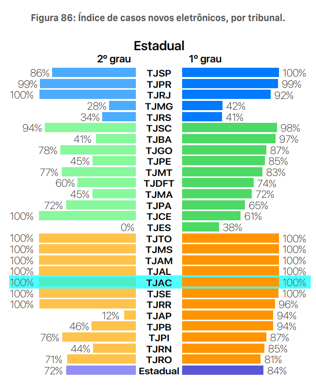 O Tribunal de Justiça do Acre (TJAC) é destaque nacional por ter 100% dos processos no 1º e 2º Grau de jurisdição totalmente eletrônicos. A informação foi divulgada no Relatório Justiça em Números de 2019, elaborado pelo Departamento de Pesquisas Judiciárias do Conselho Nacional de Justiça (CNJ), órgão responsável por controlar a eficiência e qualidade dos serviços jurisdicionais prestados pela Justiça brasileira.