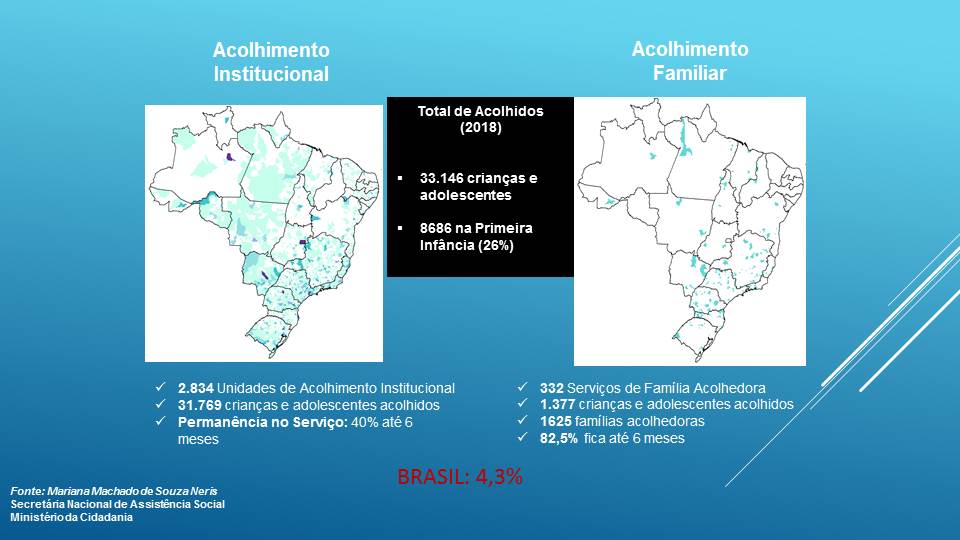 No Brasil existem 2.834 unidades de acolhimento institucional. Em 2018, foram acolhidos 33.146 crianças e adolescentes. A desproporção entre o público e o serviço comprova o tamanho do desafio de garantir a proteção infanto-juvenil. Ainda segundo dados da Secretaria Nacional de Assistência Social, há apenas 1.625 famílias acolhedoras em todo o país. A adesão ao programa ainda é baixa.