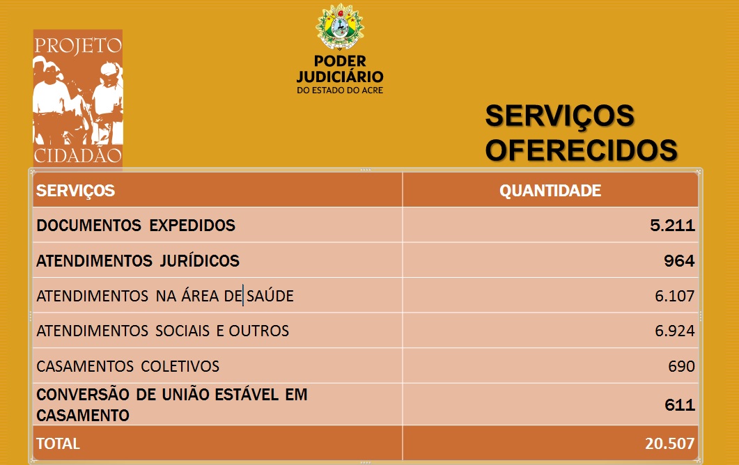 Somente neste ano de 2019, foram 20.507 atendimentos efetuados nas diversas edições promovidas. As edições ocorreram em Rio Branco (em dois locais), Porto Acre, Senador Guiomard, Cruzeiro do Sul e Jordão. Nestes locais foram oferecidos atendimentos voltados à área jurídica, da saúde, social, expedição de documentos, além do casamento coletivo e conversão de união estável em casamento, exceto Xapuri, que ocorreu apenas o casamento coletivo.