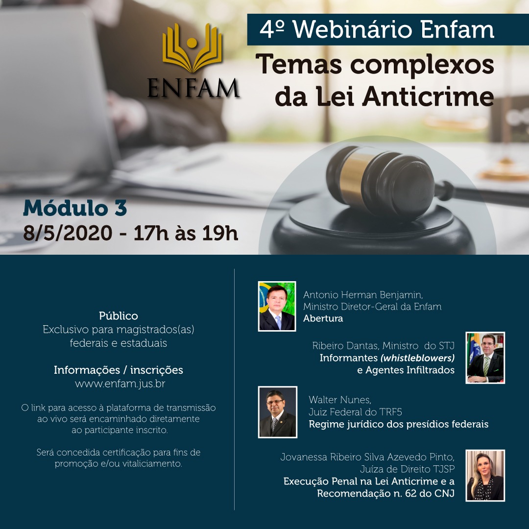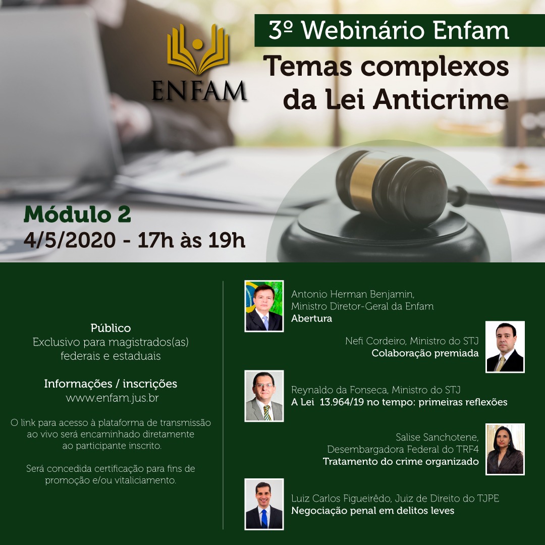 Com a presença do diretor-geral da Enfam, ministro Herman Benjamin e dos também ministros do Superior Tribunal de Justiça (STJ) Nefi Cordeiro e Reynaldo da Fonseca, além da desembargadora do Tribunal Regional Federal da 4ª Região (TRF4) Salise Sanchotene e o juiz de direito do Tribunal de Justiça de Pernambuco (TJPE) Luiz Carlos Figueirêdo, a Escola Nacional de Formação e Aperfeiçoamento de Magistrados (Enfam) vai promover o 3º Webinário Enfam – Temas complexos da Lei Anticrime, na próxima segunda-feira, 4, às 17h (hora de Brasília).