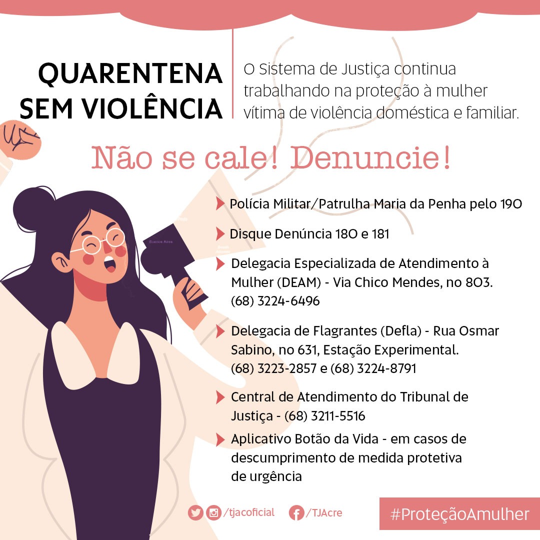 A Vara de Proteção à Mulher da Comarca de Rio Branco, por meio da equipe multidisciplinar, disponibilizou o número (68) 9.9957-5324 para as vítimas que precisarem esclarecer sobre suas medidas protetivas ou mesmo solicitar auxílio nas referidas medidas. O atendimento ocorre das 9h às 14h.