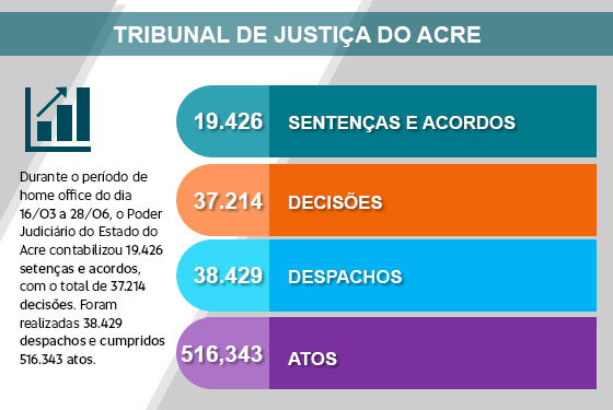 O suporte dado ao público interno vem obtendo resultados satisfatórios. Dados levantados pelo Núcleo de Estatística e Gestão Estratégica (NUEGE), do período de 16 de março a 28 de junho, por exemplo, indicam que Poder Judiciário do Acre contabilizou 19.426 sentenças e acórdão com um total de 37.214 decisões. Foram realizados 38.429 despachos e cumpridos 516.343 atos.