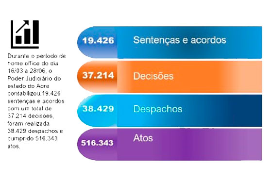 O suporte dado ao público interno vem obtendo resultados satisfatórios. Dados levantados pelo Núcleo de Estatística e Gestão Estratégica (NUEGE), do período de 16 de março a 28 de junho, por exemplo, indicam que Poder Judiciário do Acre contabilizou 19.426 sentenças e acórdão com um total de 37.214 decisões. Foram realizados 38.429 despachos e cumpridos 516.343 atos.