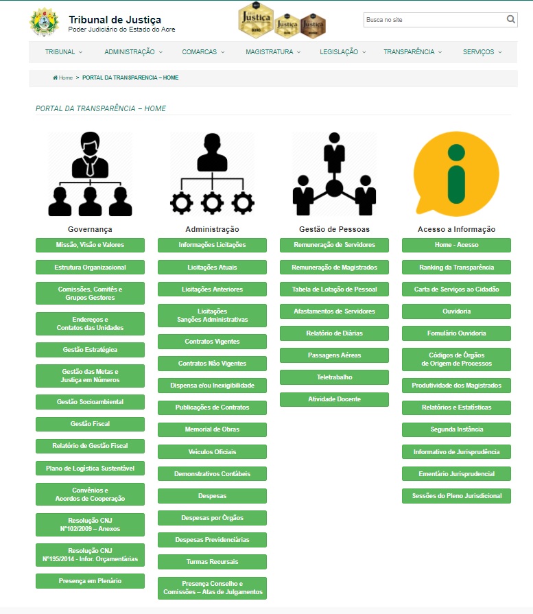 No Portal da Transparência do TJAC é possível verificar dados sobre governança, administração, gestão de pessoas e ainda solicitar informações dentro da Lei de Acesso à Informação. Cada um desses quatro menus se desdobram em mais informações, deixando a busca mais específica, conforme o tipo de dado desejado.