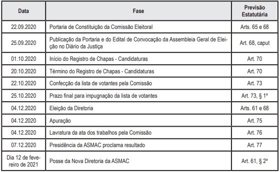 Na mesma portaria, o atual presidente da Asmac, Danniel Bomfim, convoca a Assembleia Geral Eleitoral para o dia 04 de dezembro de 2020, no período de 8h as 17h, e estabelece o prazo para registro de chapas do dia 1 a 20 de outubro, das 8h as 14h, na sede-administrativa da entidade.