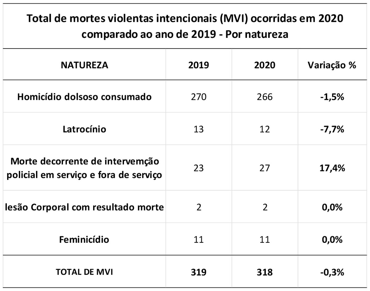No que diz respeito ao comportamento do número de mortes violentas intencionais (MVI), este indicador apresentou também significante redução de 24% no ano de 2019 em relação a 2018, caindo de uma taxa de 48,0 para 33,2 vítimas para cada grupo de 100 mil habitantes. Já em 2020 houve uma redução de 0,3%.