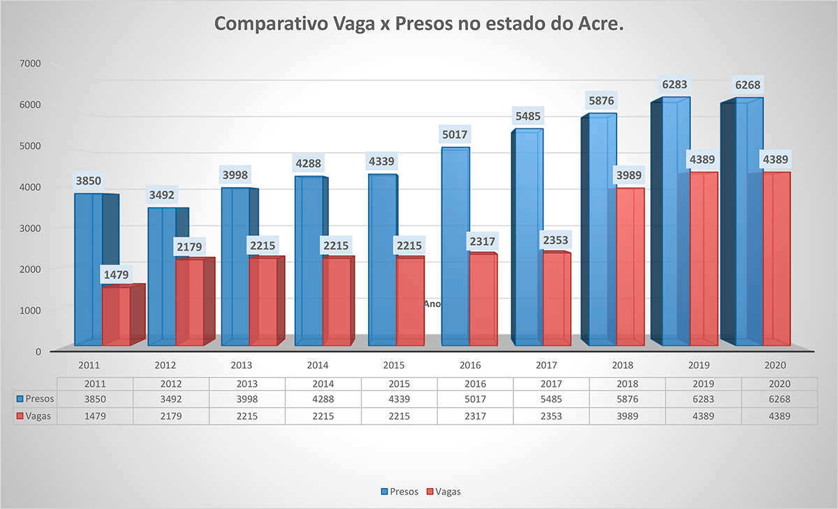 Em relação aos jovens, o cenário não era diferente. Segundo dados do Instituto Socioeducativo (ISE), em maio de 2020 o número de adolescentes privados de liberdade no Acre era de 401, alcançando uma taxa de ocupação de 115%. Em dezembro de 2020 esse número foi reduzido para 288, reduzindo também a sua taxa de ocupação para 81%.