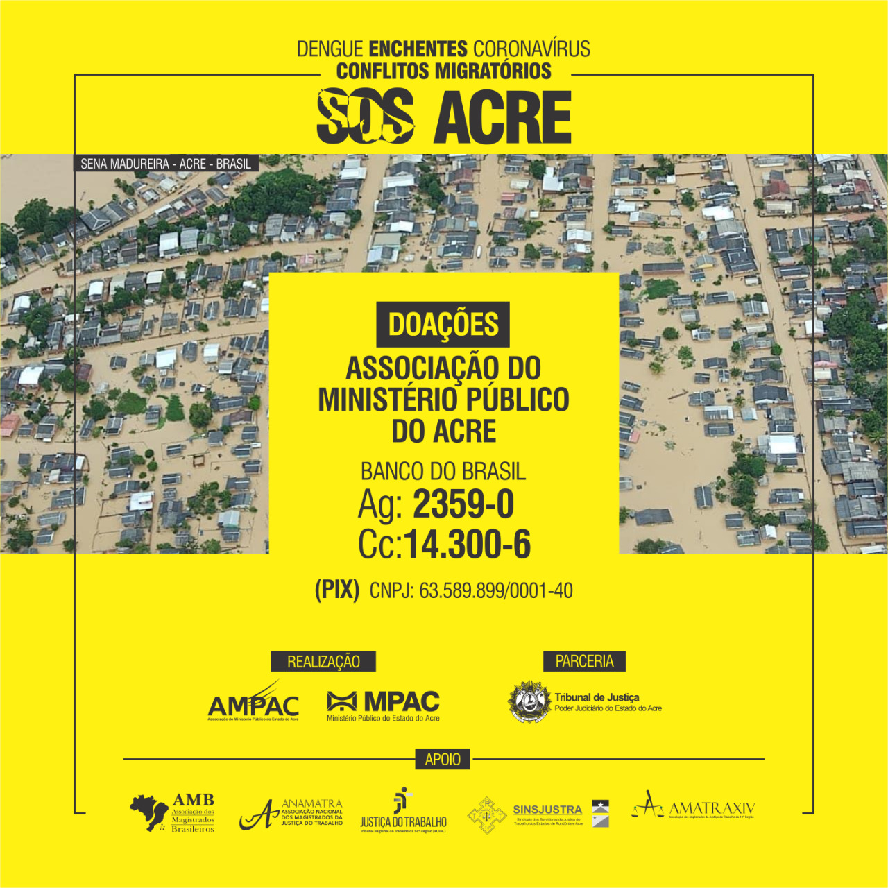 O Acre encontra-se em situação de emergência devido ao agravamento da pandemia do coronavírus, surto de dengue, enchentes, além da crise migratória. Diante desse cenário, o Ministério Público do Estado do Acre (MPAC) em parceria com o Tribunal de Justiça do Acre (TJAC), realiza a campanha ‘SOS Acre’, para ajudar as famílias atingidas.