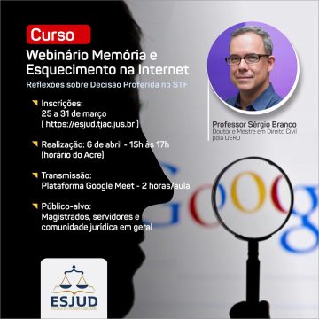 Webinário “Memória e Esquecimento na Internet – Reflexões sobre Decisão Proferida no STF”, que acontecerá com o lançamento do Programa de Atualização Jurisprudencial Cível e Criminal, a realizar-se no dia 06 de abril de 2021, às 15h, pela plataforma on-line Google Meet. O evento será ministrado pelo advogado, Doutor Sérgio Branco. Saiba mais