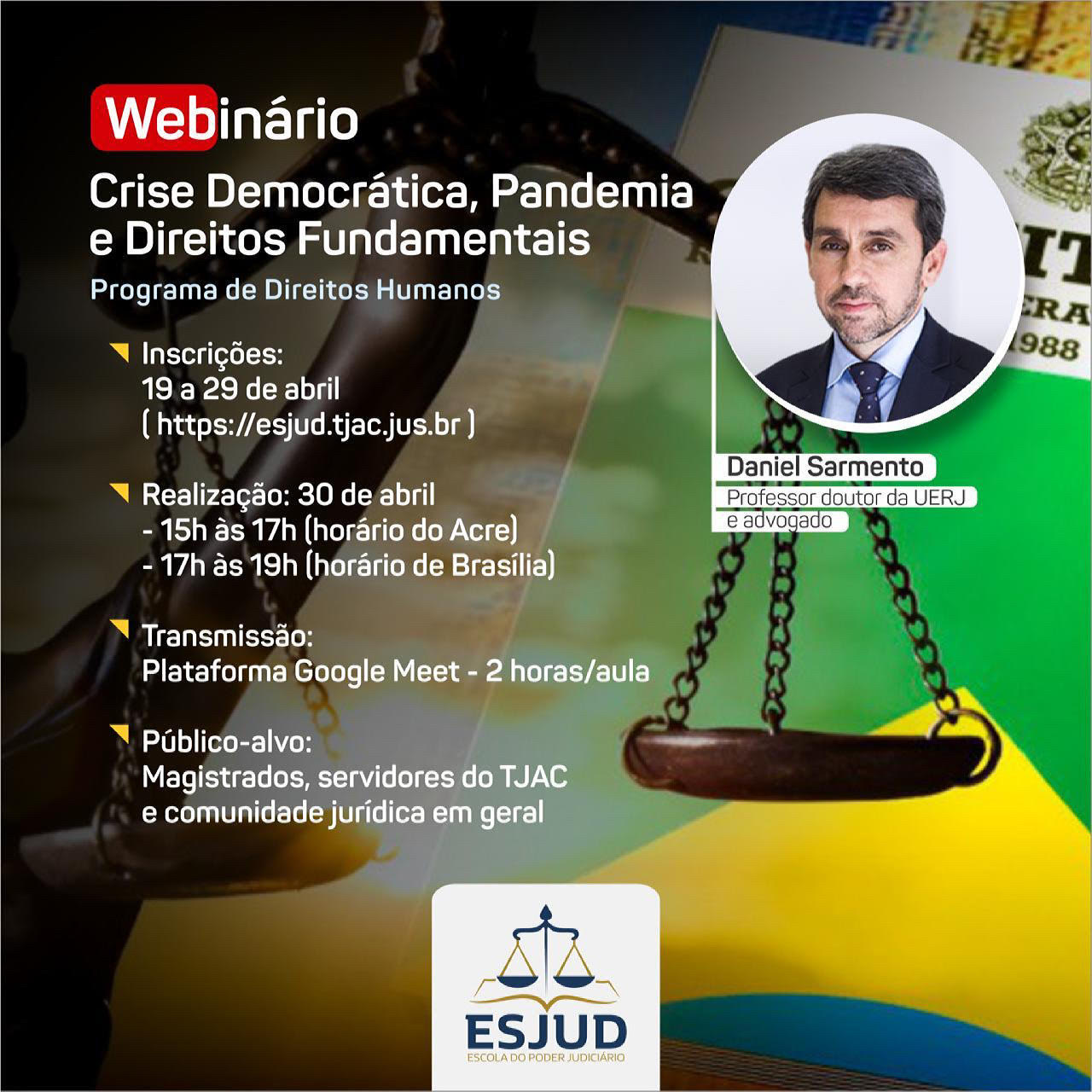 Por ocasião do lançamento do Programa de Direitos Humanos neste mês de abril, a Escola do Poder Judiciário (Esjud) tornou públicas as inscrições para dois webinários, com os doutores Ingo Sarlet e Daniel Sarmento, renomados profissionais do Brasil na área do Direito.