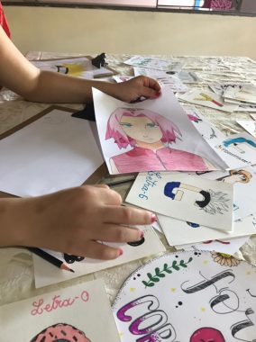 “Essa atividade é boa para trabalhar a mente e distrair as pessoas. Então eu fui tentando passar os passos para elas começarem a desenhar as letras e mostrando um pouco da minha evolução, como também mostrando as artes que fiz e que quais os materiais podem ser personalizados com o lettering”, disse Tacila.
