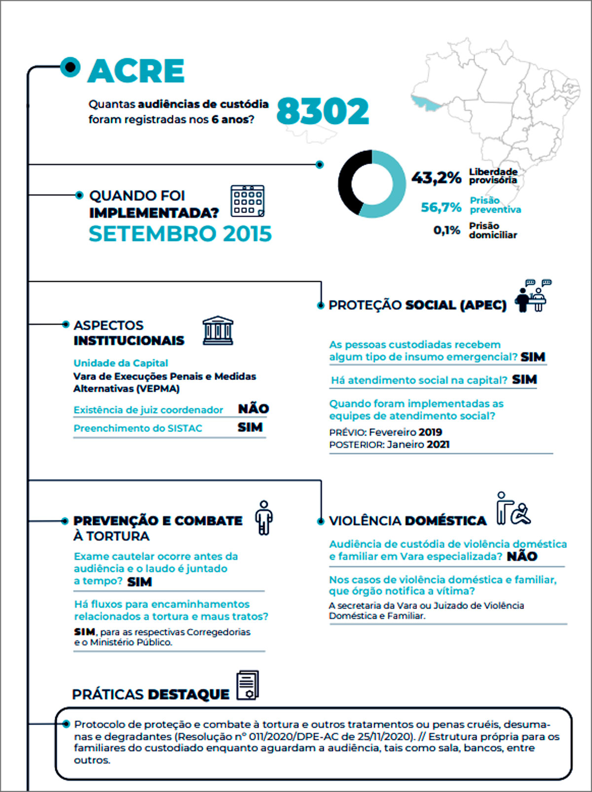 Em fevereiro de 2021, a audiência de custódia completou seis anos no país. Considerando os avanços dos últimos dois anos e a celebração deste importante passo civilizatório para a justiça criminal brasileira. No Acre, foram 8.302 em 6 anos de audiências de custódias.