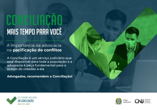 A Semana Nacional de Conciliação foi criada pelo Conselho Nacional de Justiça (CNJ) e nesse ano a instituição inovou veiculando artes da campanha também voltada para a sensibilização da Advocacia, para que os profissionais do Direito possam compartilhar informações em suas redes sociais. Colabore!