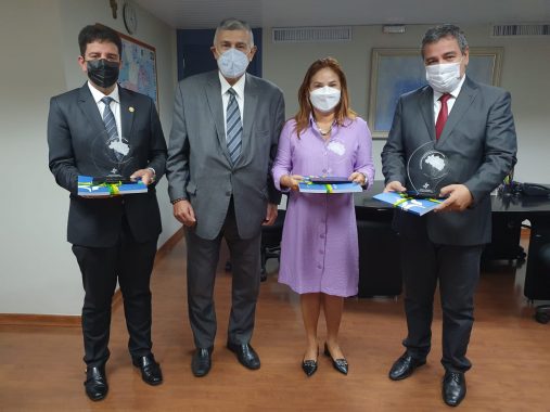 Em agenda em Brasília, a presidente do Tribunal de Justiça do Acre (TJAC), Waldirene Cordeiro, acompanhada do corregedor-geral da Justiça, desembargador Elcio Mendes, e do governador do Acre, Gladson Cameli, esteve no Tribunal Regional Federal da 1ª Região (TRF-1), nesta sexta-feira, 19.