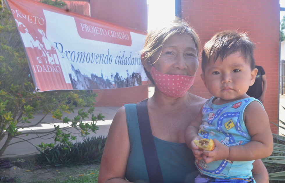 Entre eles, estava Fernanda Dure Batista Jaminawá, tem 20 anos e é moradora da Aldeia 3 Cachoeiras, que fica a aproximadamente 3 horas de viagem de barco. Ela foi acompanhada do filho de 4 meses, que ainda não tem nome, para participar da ação em busca do primeiro RG, porque a aquisição do documento possibilitará dar entrada nos auxílios do governo para auxiliar na renda familiar. “Estou feliz pelo Projeto Cidadão estar em Assis Brasil e poder tirar meus documentos pra poder dar entrada nos auxílios do governo”, afirmou sorridente.