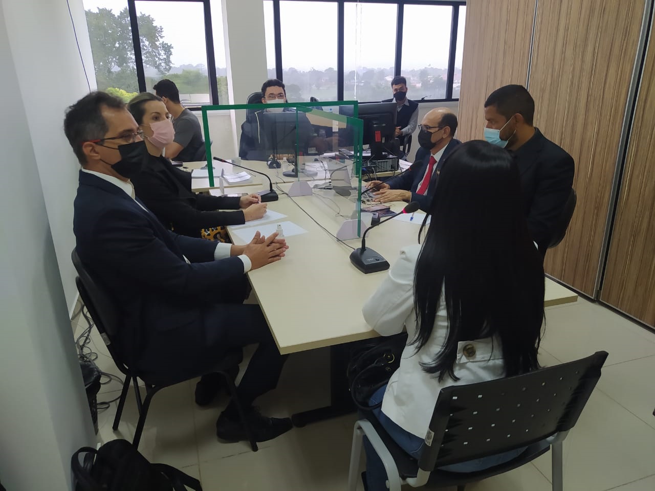 Imagem da sala de audiência. Uma mesa em formato de T, na ponta o juiz e dois assessores, nas laterais os representantes do Ministério Público e Defensoria Publica e na ponta de costas a câmera e de frente para o juiz uma pessoa presta depoimento.