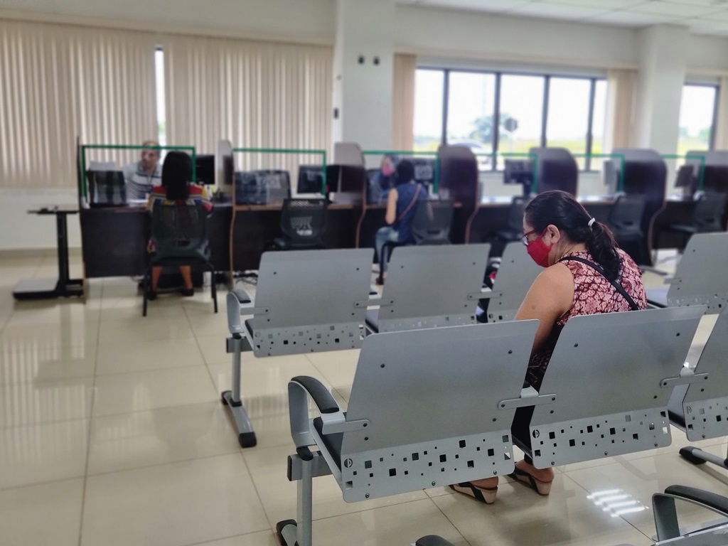 Imagem do setor de atermação dos Juizados. Na foto estão as cadeiras de espera, que são de metal e tem uma mulher sentada aguardando e na frente um balcão com várias baias de atendimento, sendo que mais duas pessoas são atendidas por servidores nessas baias