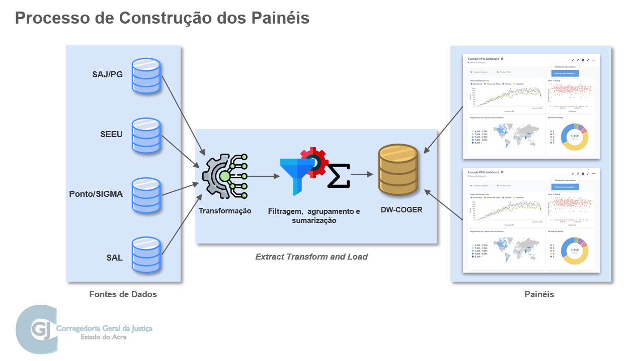 Por meio de processos de inteligência de negócios, os dados extraídos dos sistemas SAJ/PG, SEEU, Ponto Sigma e SAL, serão processados, transformados e disponibilizados em painéis com gráficos e estatísticas, que serão exibidos em monitores dispostos em pontos estratégicos dentro da Corregedoria-Geral.