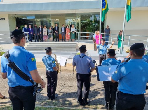 Nesta segunda-feira (23), a Direção da Esjud conduziu a solenidade comemorativa aos 35 anos de sua fundação. Como primeiro ato, realizado pelas desembargadoras Waldirene Cordeiro, governadora do Acre em exercício, e Regina Ferrari, diretora da Escola, foram hasteados os pavilhões nacional e estadual. Ao som do hino nacional brasileiro – executado pela briosa banda da Polícia Militar, sob regência do maestro capitão Ramos – autoridades, profissionais da Justiça e membros de outras instituições prestigiaram um evento concorrido e bastante prestigiado.