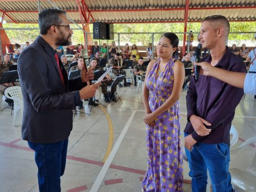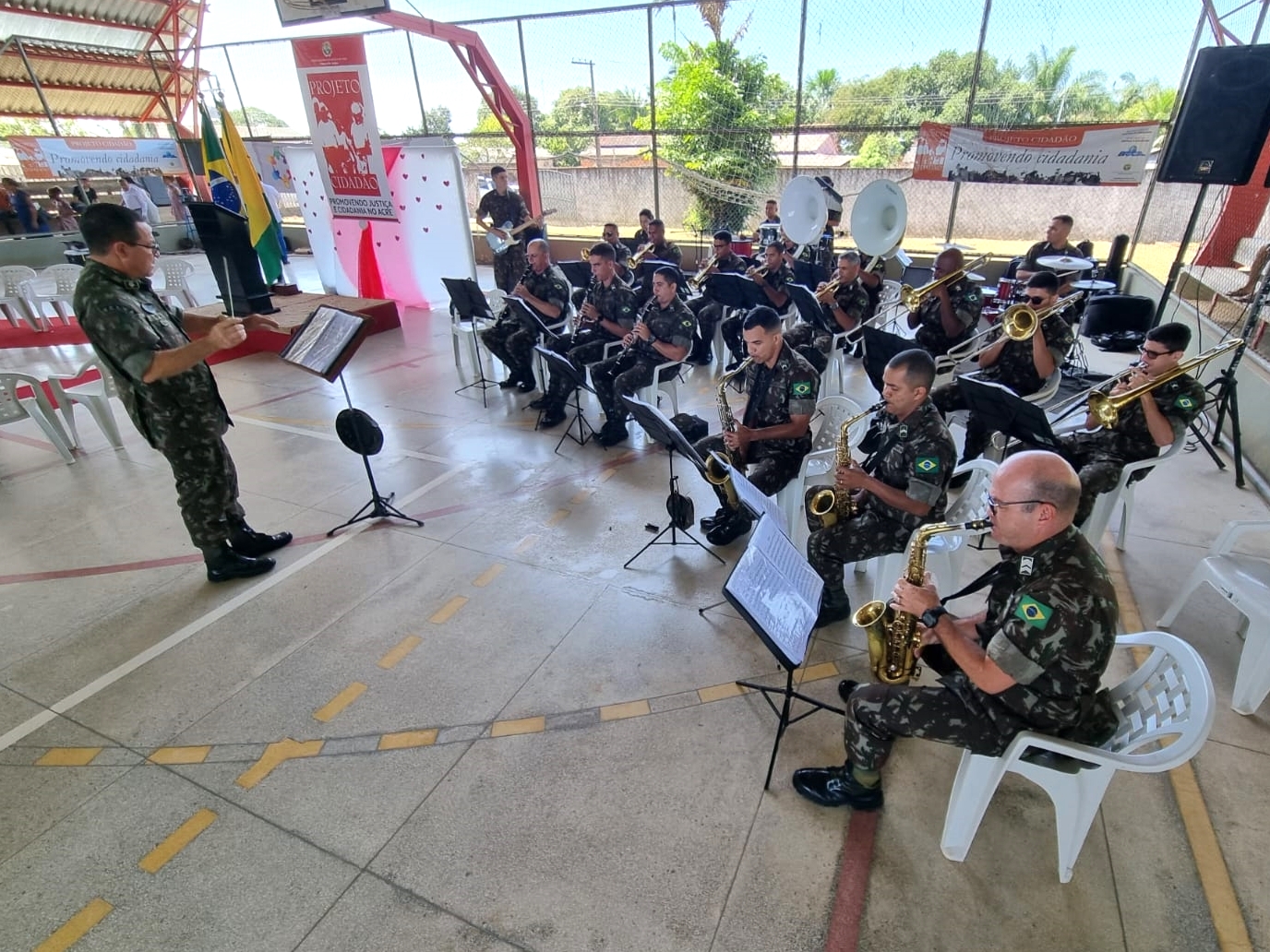 Antes do início da solenidade, os noivos e a comunidade aplaudiram a apresentação da banda de música do 4º Batalhão de Infantaria e Selva (Bis), do Exército Brasileiro.