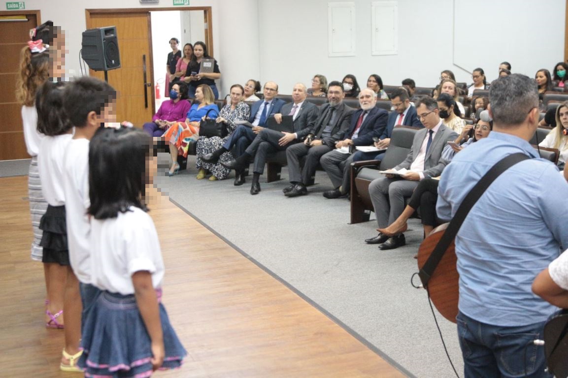 A desembargadora Regina Ferrari, coordenadora da Infância e da Juventude do TJAC iniciou usa fala abordando sobre a reativação do coral “Filhos da Esperança”, do programa Fortalecendo Vidas, que é desenvolvido por voluntários.