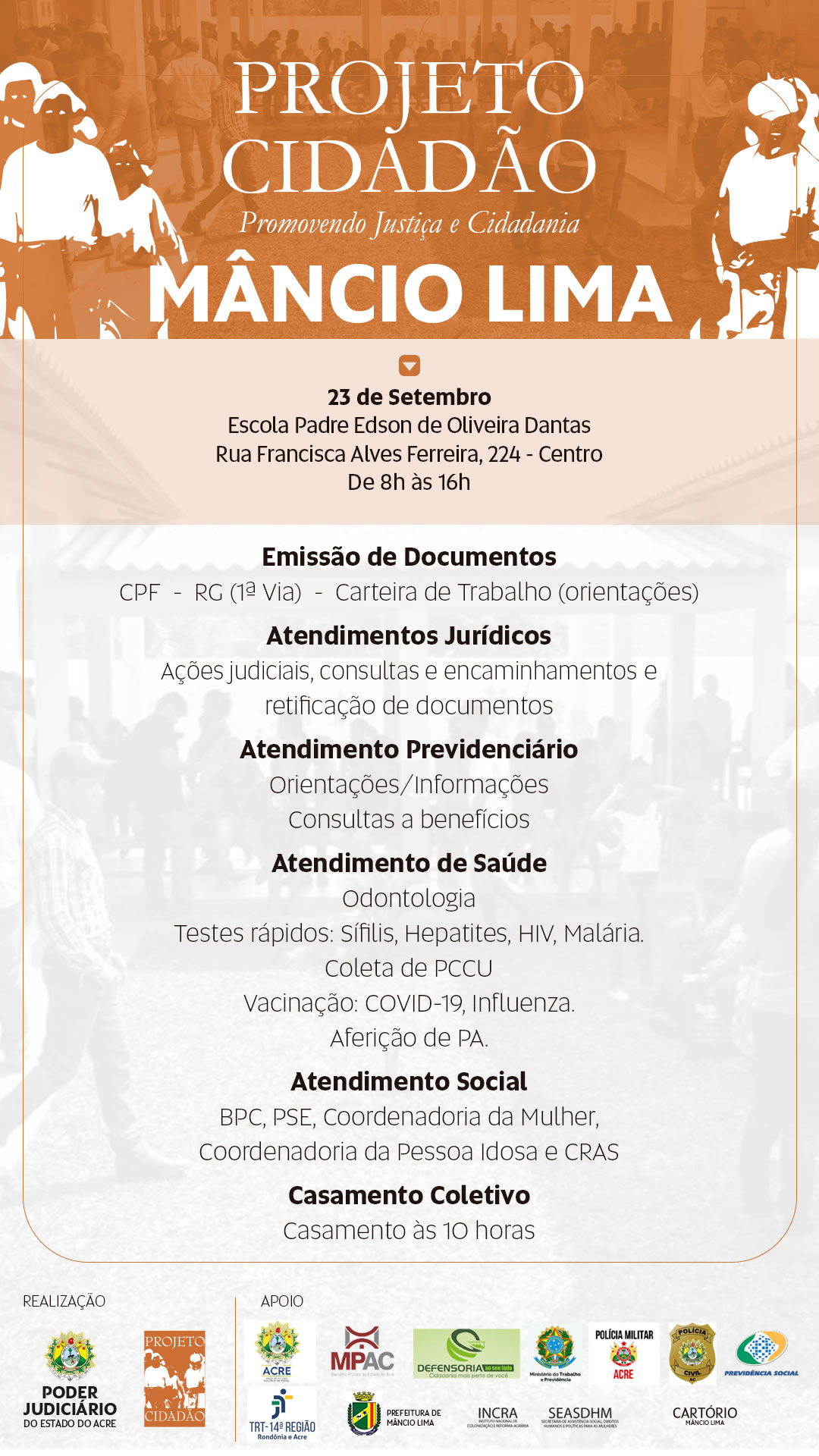 Atenção, você que mora em Mâncio Lima: está precisando regularizar algum documento? Tirar dúvidas sobre questões jurídicas? Ou até colocar em ordem o cartão de vacinação? Participe da edição do Projeto Cidadão que será realizada na cidade amanhã, sexta-feira, 23, na Escola Padre Edson de Oliveira Dantas, na Rua Francisca Alves Ferreira, número 224, no Centro.