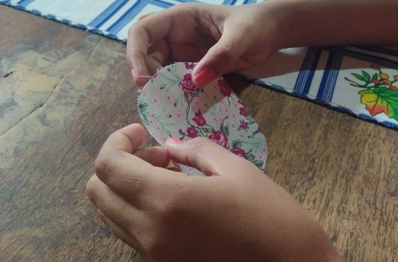 Logo após a solenidade de abertura, as meninas puderam ter o primeiro contato com o material para fazer o fuxico. Elas aprenderam a técnica para fazer o fuxico tradicional com um pedaço de tecido alinhavado nas extremidades com pontos delicados que são franzidos no final.