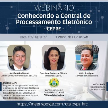 Um novo webinário foi promovido para apresentação da Central de Processamento Eletrônico, a CEPRE. Desta vez, a atividade aconteceu nessa sexta-feira, 2, para magistradas, magistrados, servidoras, servidores da Comarca de Rio Branco, das Varas de Família, das Varas da Fazenda Pública, das Varas Cíveis, Juizados Cíveis das Comarcas de Assis Brasil, Brasileia e Bujari.