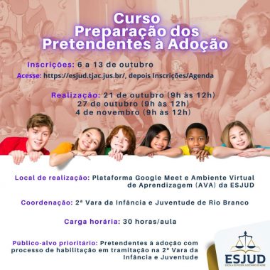 Como os pretendentes à adoção com processo de habilitação em tramitação na 2ª Vara da Infância e Juventude são o público-alvo, a Coordenadoria da Infância e Juventude do Tribunal de Justiça do Acre é que estará com a lista de quem deve participar e comunicará a eles sobre o curso. Mesmo assim é necessário que esses pretendentes efetuem a inscrição no site da Esjud.