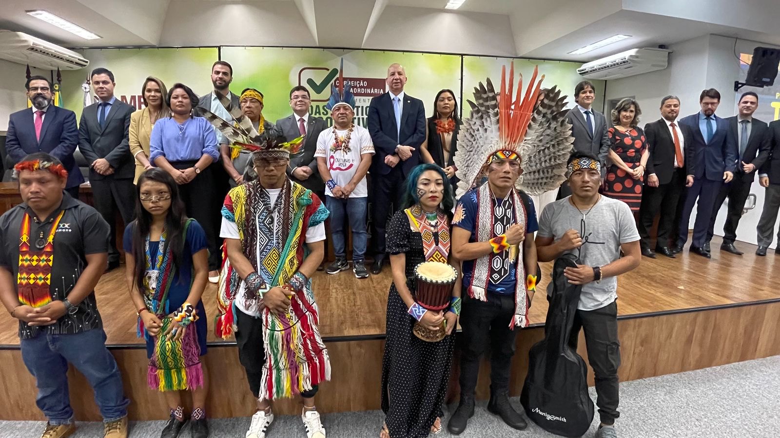 Representando o Nusap/TJAC, o juiz de Direito Daniel Gustavo Bomfim. Compuseram também o dispositivo de honra, o corregedor-geral do MPAC, Álvaro Luiz Araújo Pereira, a coordenadora do Natera, Patrícia de Amorim Rêgo, a coordenadora do Caop de Defesa dos Direitos Humanos e Cidadania, procuradora de Justiça Kátia Rejane de Araújo Rodrigues, a vice-prefeita de Rio Branco, Marfisa Galvão, o procurador Regional dos Direitos do Cidadão do MPF, Lucas Costa, a ouvidora-geral da Defensoria Pública do Acre, Soleane Manchineri, e a representante da Organização das Mulheres Indígenas do Acre, Nedina Yawanawa.